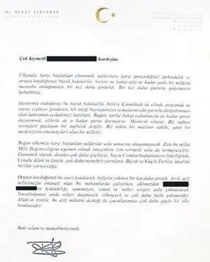 "Ülkemize karşı başlatılan saldırılar asla amacına ulaşamayacak" diyen Bakan Albayrak, mektubu şöyle tamamladı: "Bu millet milli bağımsızlığına egemen olmak isteyenlere asla izin vermeyecek. Ekonomik olarak, dünden çok daha güçlüyüz. Bu eşsiz fedakârlık, yükümüzü bir kat daha artırdı. Allah'ın izniyle, bu aziz milletin desteği ile çocuklarımıza çok daha güçlü bir ülke bırakacağız."